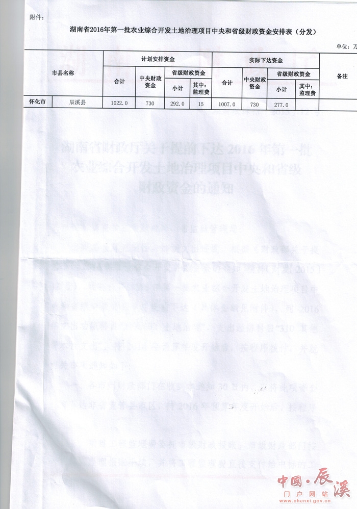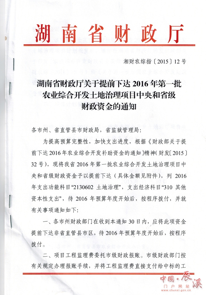 湖南省财政厅关于提前下达2016年第一批农业综合开发土地治理项目中央和省级财政资金的通知