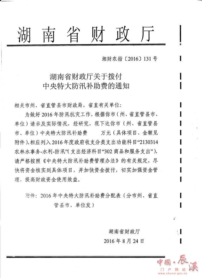 湖南省财政厅关于拨付中央特大防汛补助费的通知