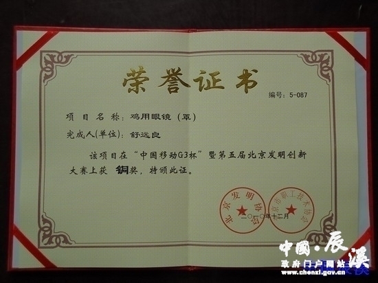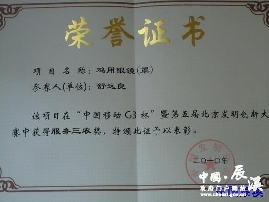 3月29日,从辰溪县特禽养殖合作协会传出喜讯:该协会会长舒远良发明的鸡用眼镜(罩),从来自全国26个省市地区的1037项发明项目中脱颖而出,在3月22日举行的第五届北京发明创新大赛颁奖中荣获铜奖,并因其简单实用,在大赛上被中国发明协会授予“服务三农”奖。