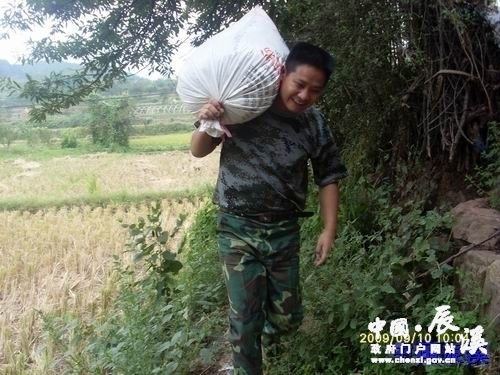 图为方小华正在带头扛运稻谷