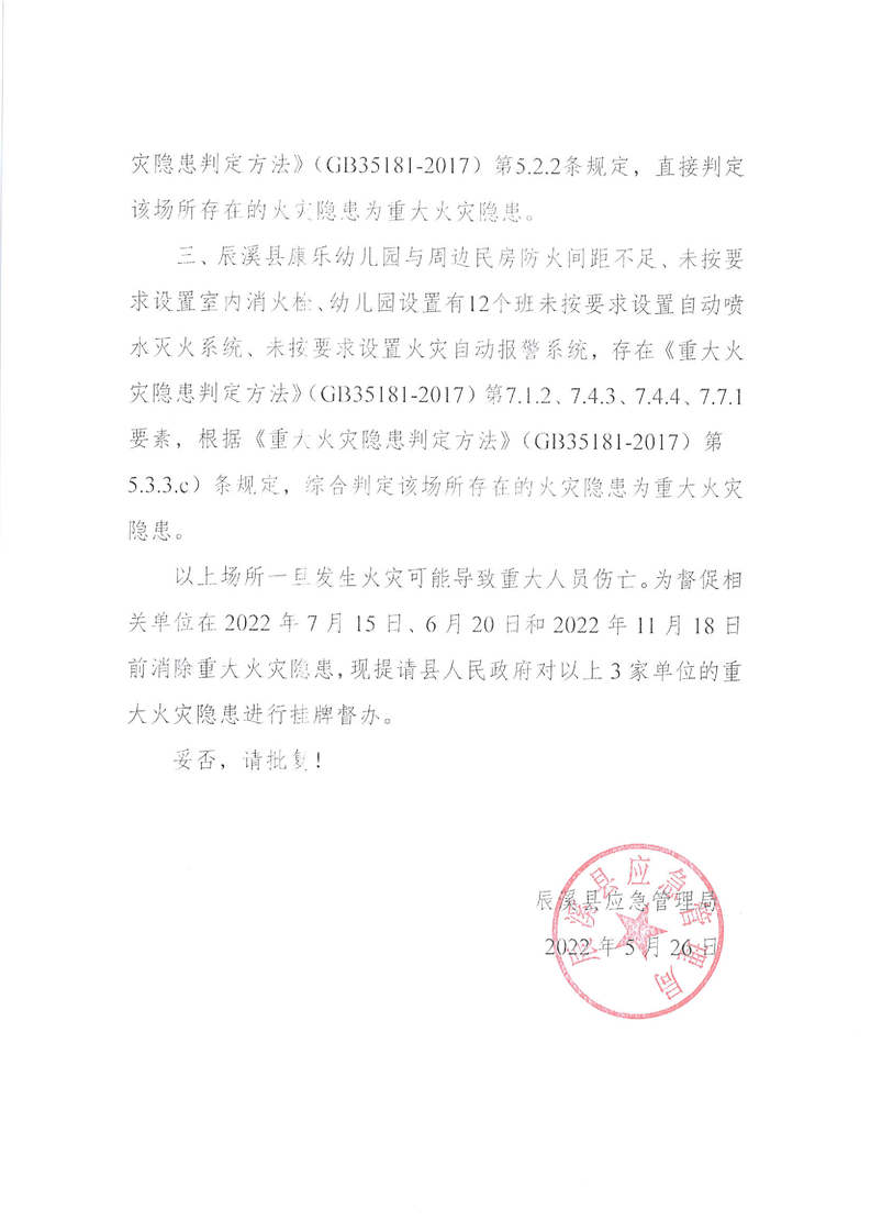 关于将辰溪县晨龙壹陆捌酒店经营管理有限公司等3家单位的重大火灾隐患挂牌督办的请示