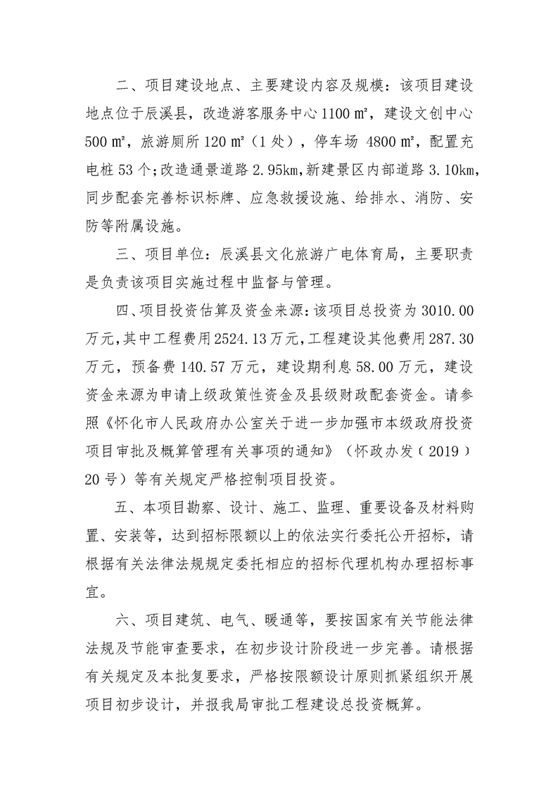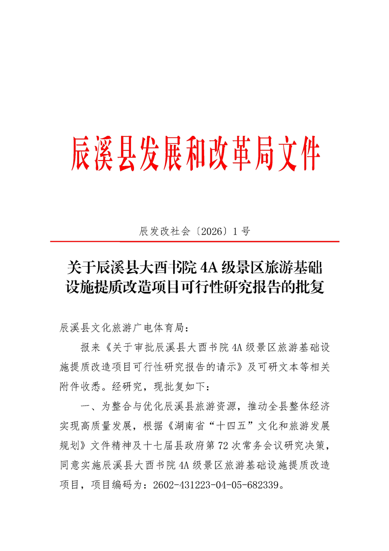 关于辰溪县大酉书院4A级景区旅游基础设施提质改造项目可行性研究报告的批复