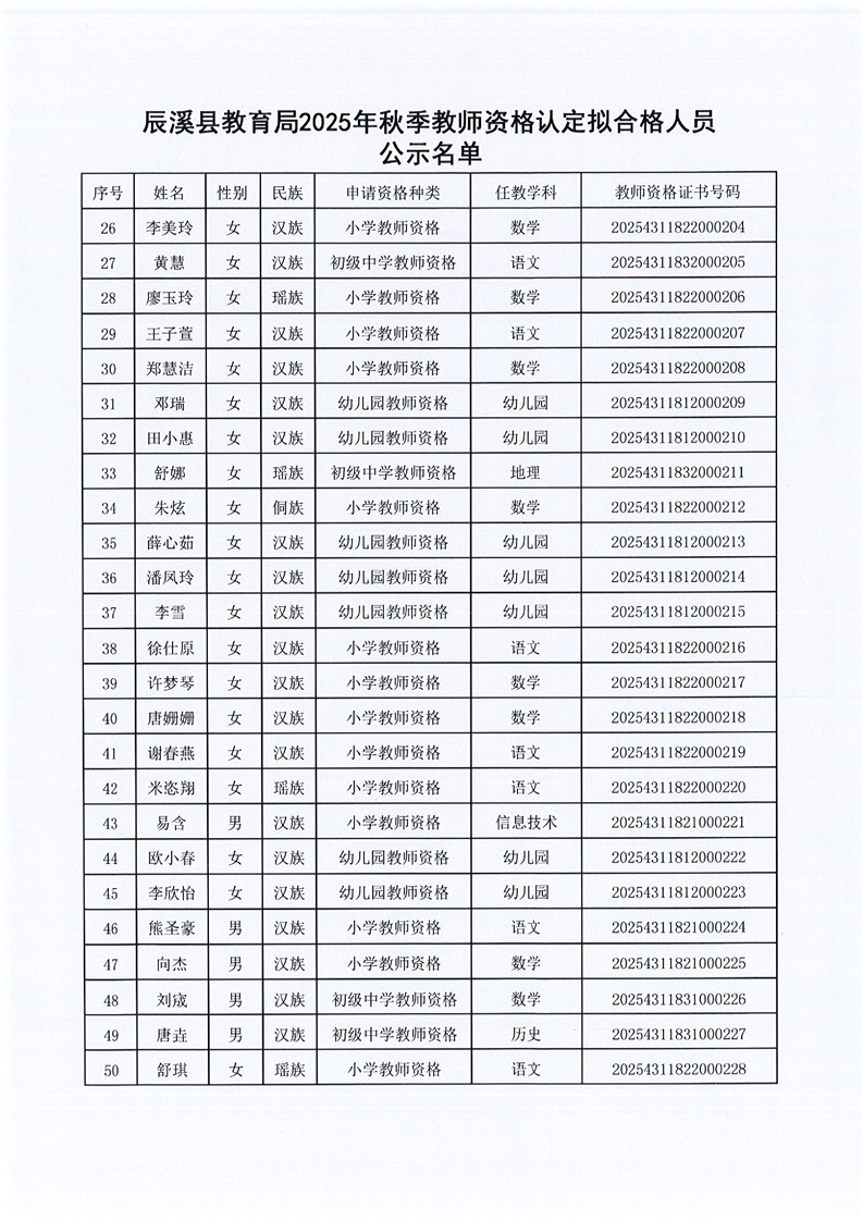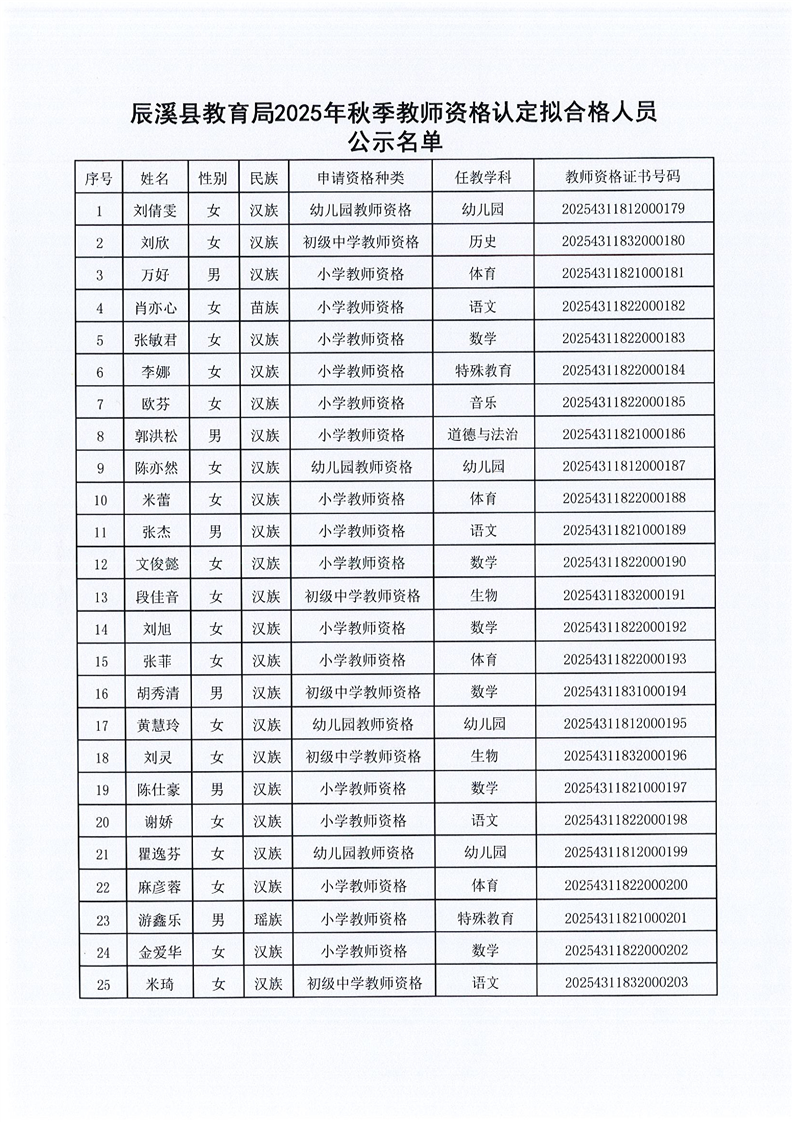 辰溪县教育局2025年秋季教师资格认定拟合格人员公示