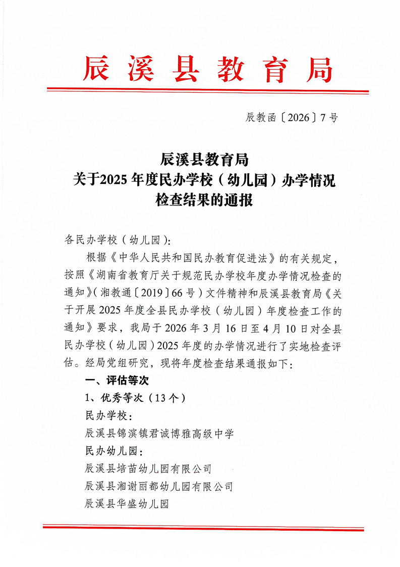 关于2025年度民办学校(幼儿园)办学情况检查结果的通报