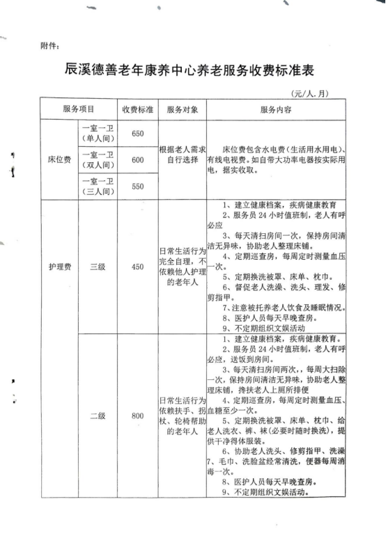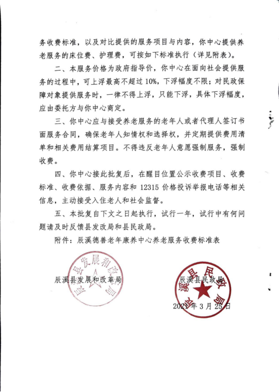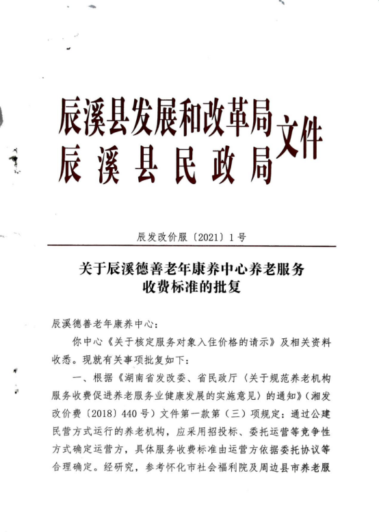 关于辰溪德善老年康养中收养老服务收费标准的批复