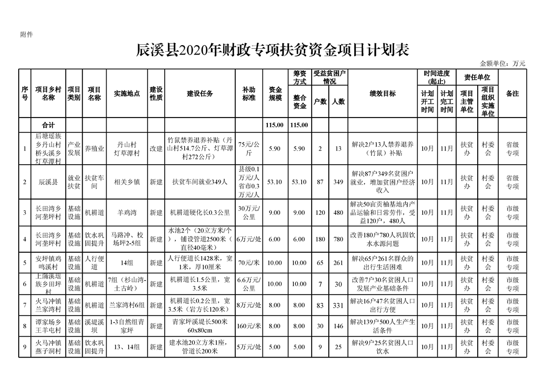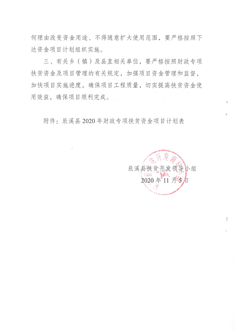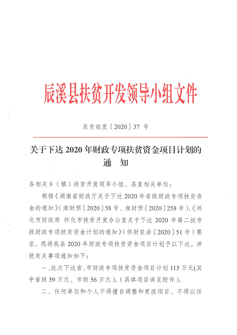 辰溪县扶贫开发领导小组关于下达2020年财政专项扶贫资金项目计划的通知