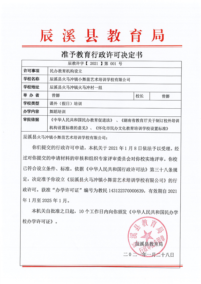 准予教育行政许可决定书 辰教许字〔2021〕第001号