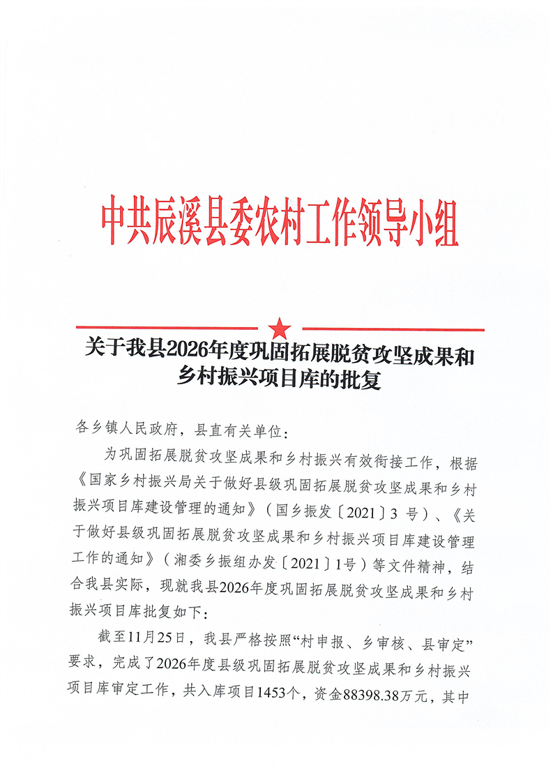 关于我县2026年度巩固拓展脱贫攻坚成果和乡村振兴项目库的批复