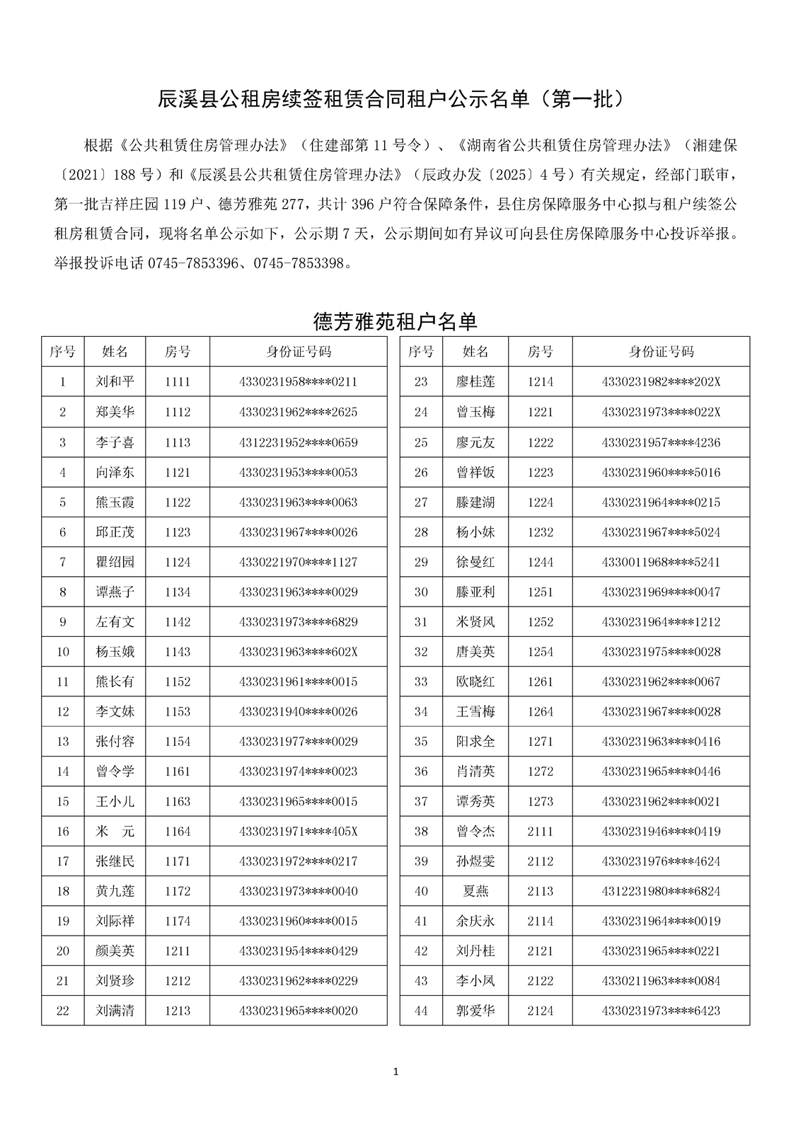 辰溪县公租房续签租赁合同租户公示名单(第一批)