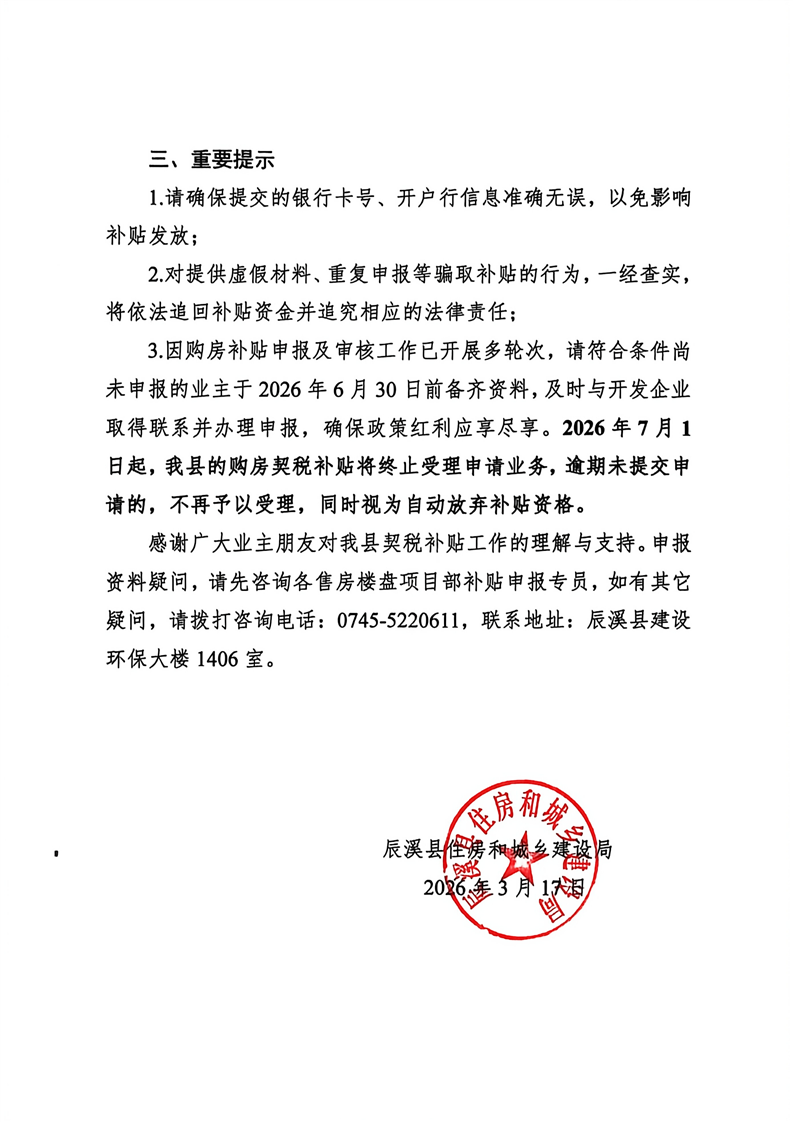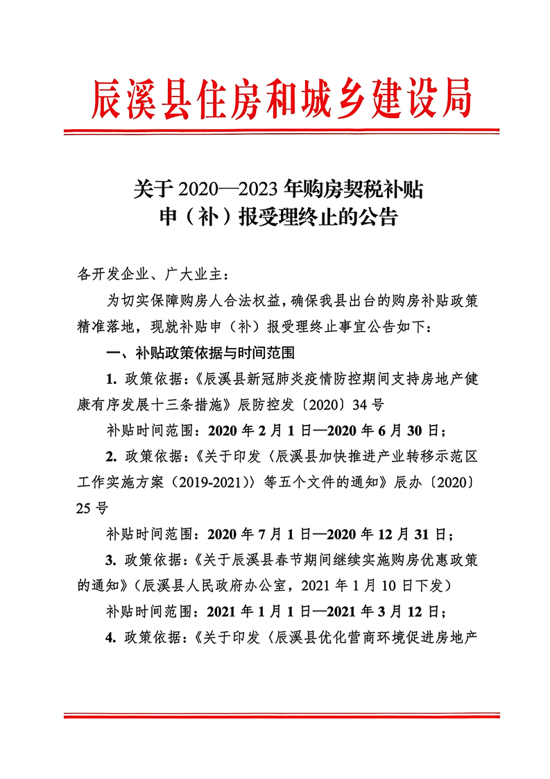 辰溪县住房和城乡建设局关于2020-2023年购房契税补贴申(补)报受理终止的公告