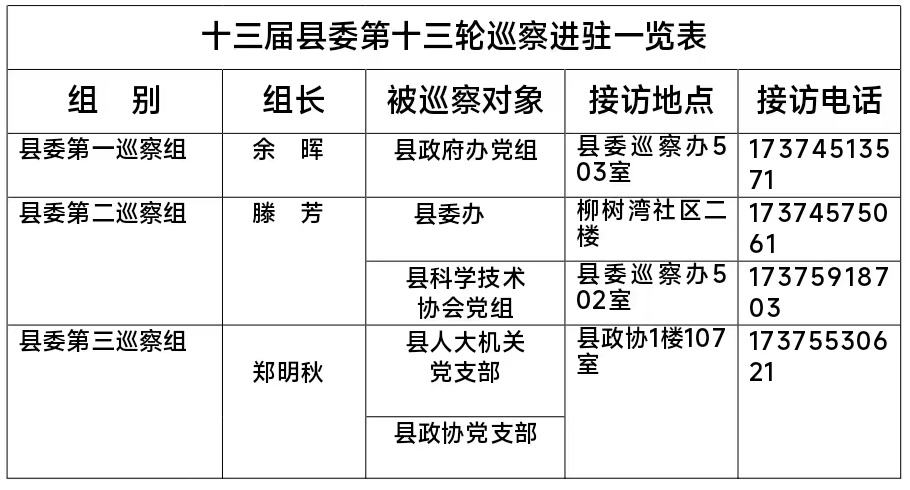 据悉,各县委巡察组将在被巡察单位工作2个月左右,其间设立专门值班电话、接收短信手机、邮政信箱、“码上巡”等信访举报方式,主要受理反映被巡察党组织领导班子及其成员、下一级党组织主要负责人和重点岗位人员问题的来信来电来访,重点是关于违反政治纪律、组织纪律、廉洁纪律、群众纪律、工作纪律和生活纪律等方面的举报和反映。县委巡察组受理信访时间截止到2026年5月20日。
